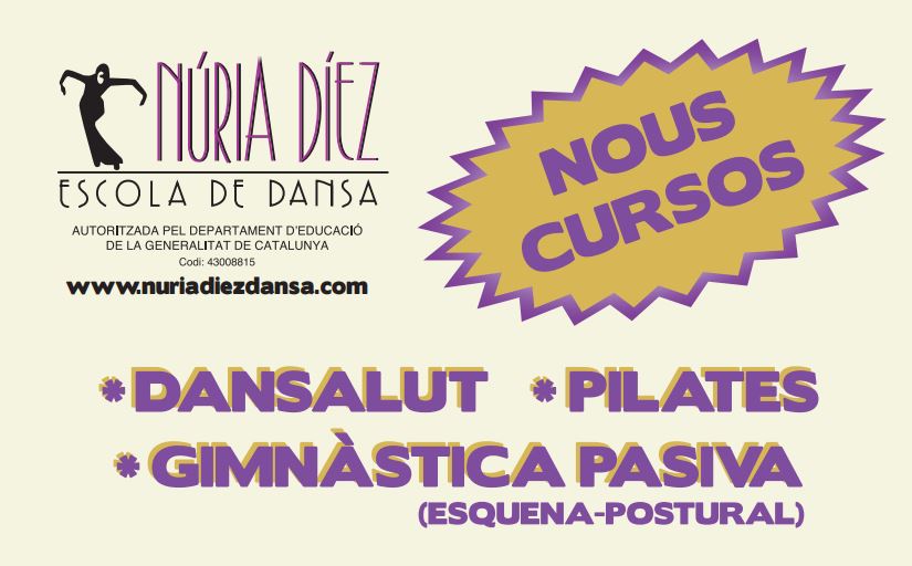 L’Escola de Dansa Núria Díez organitza un curs de pilates, del 21 de febrer al 16 de maig. Més informació http://www.apdansatgn.com/wp-content/uploads/DANSALUT.pdf